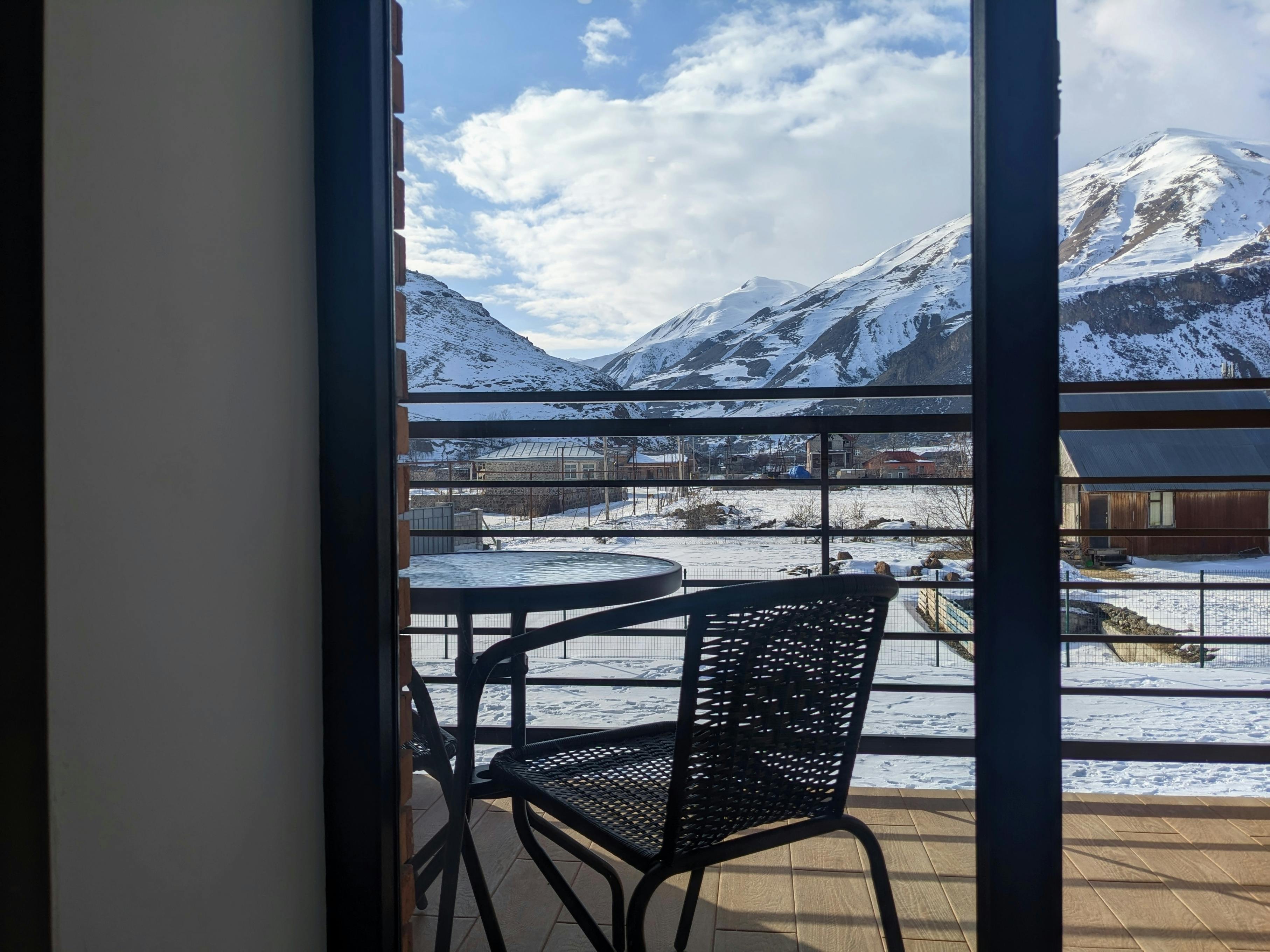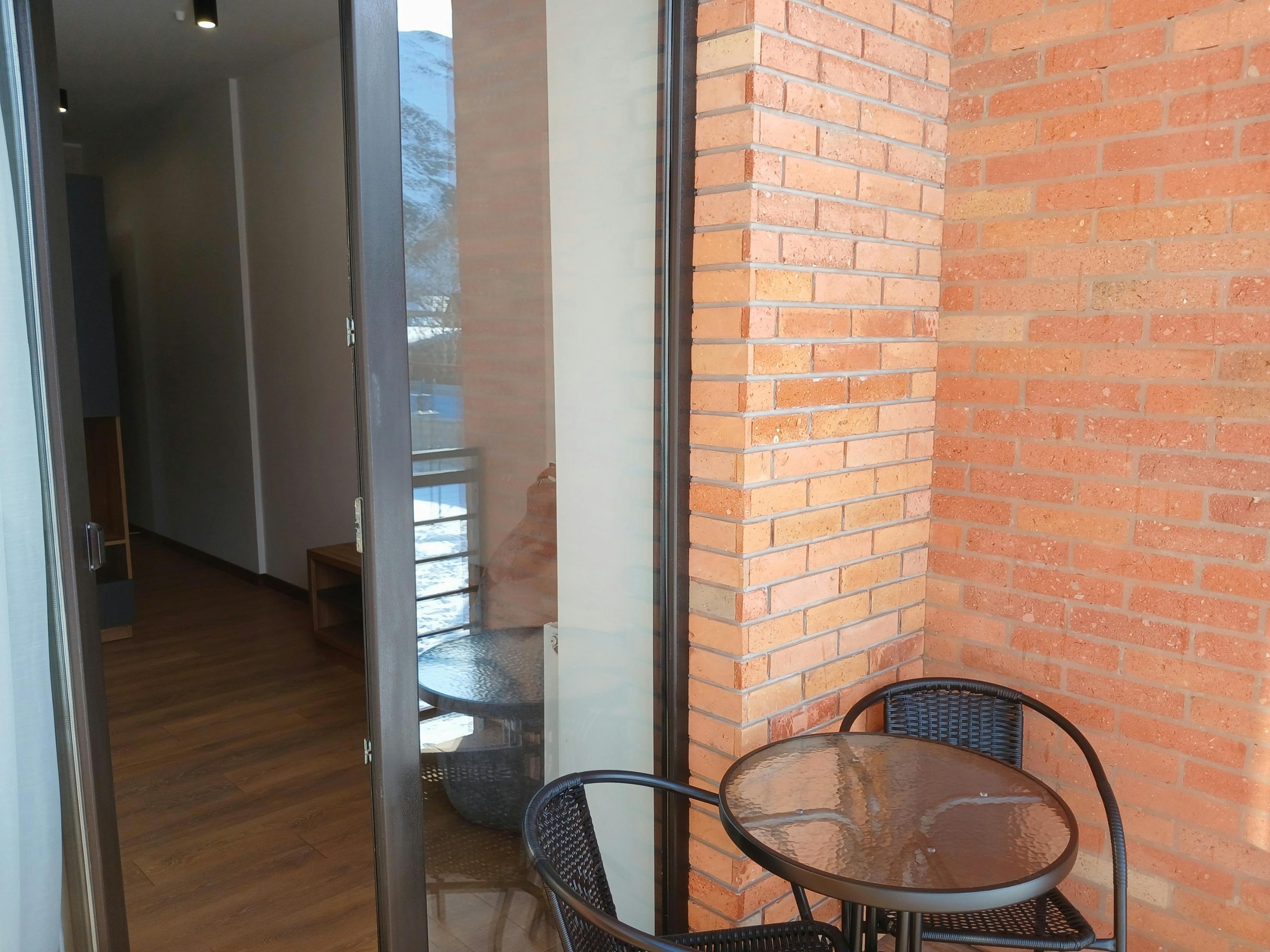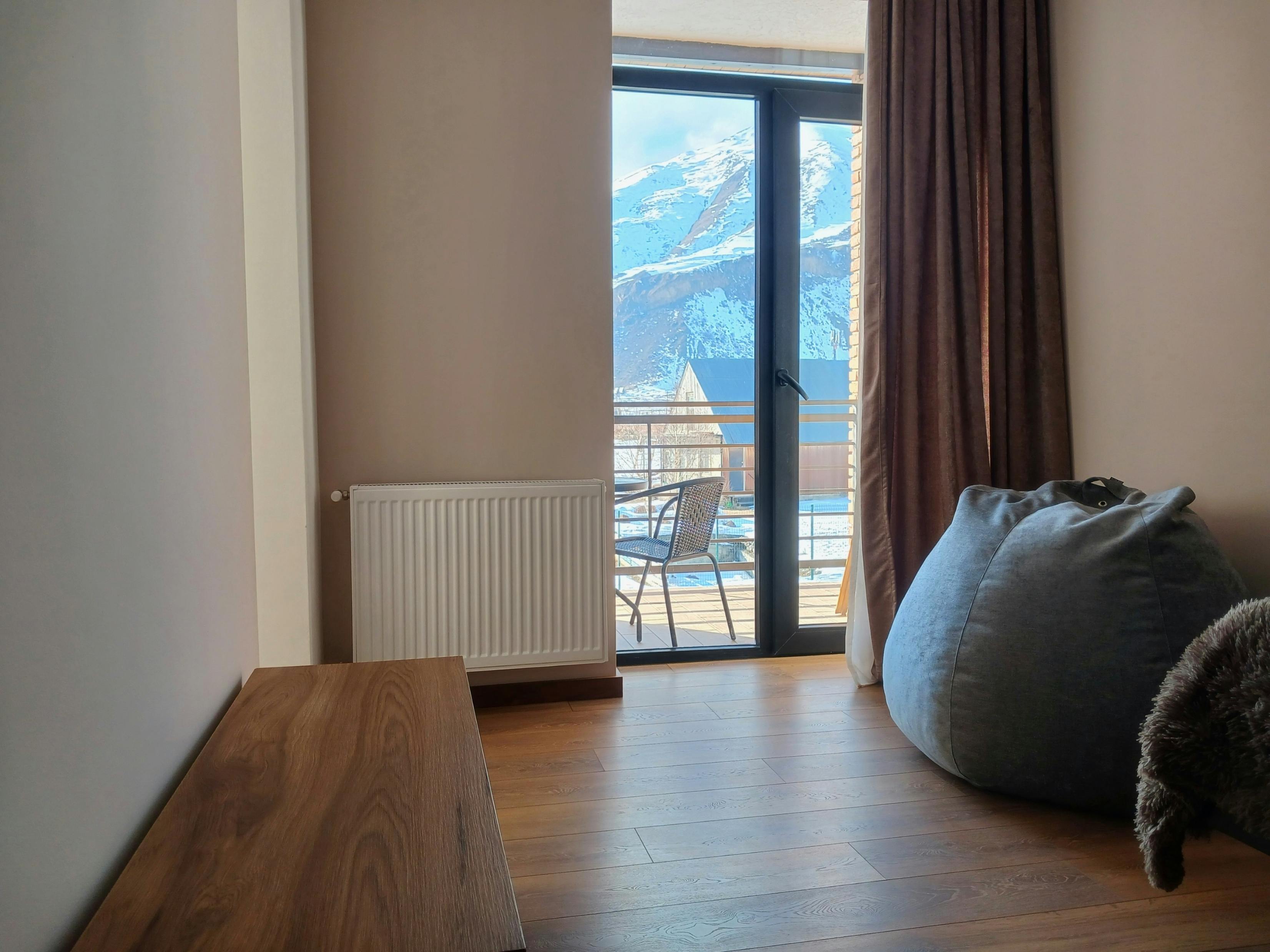 This double room features a comfortable twin bed, a private balcony with stunning mountain views, and a separate small room with a dining table and a sofa-bed for added convenience and flexibility. Perfect for couples or small groups seeking a cozy retreat with scenic charm.